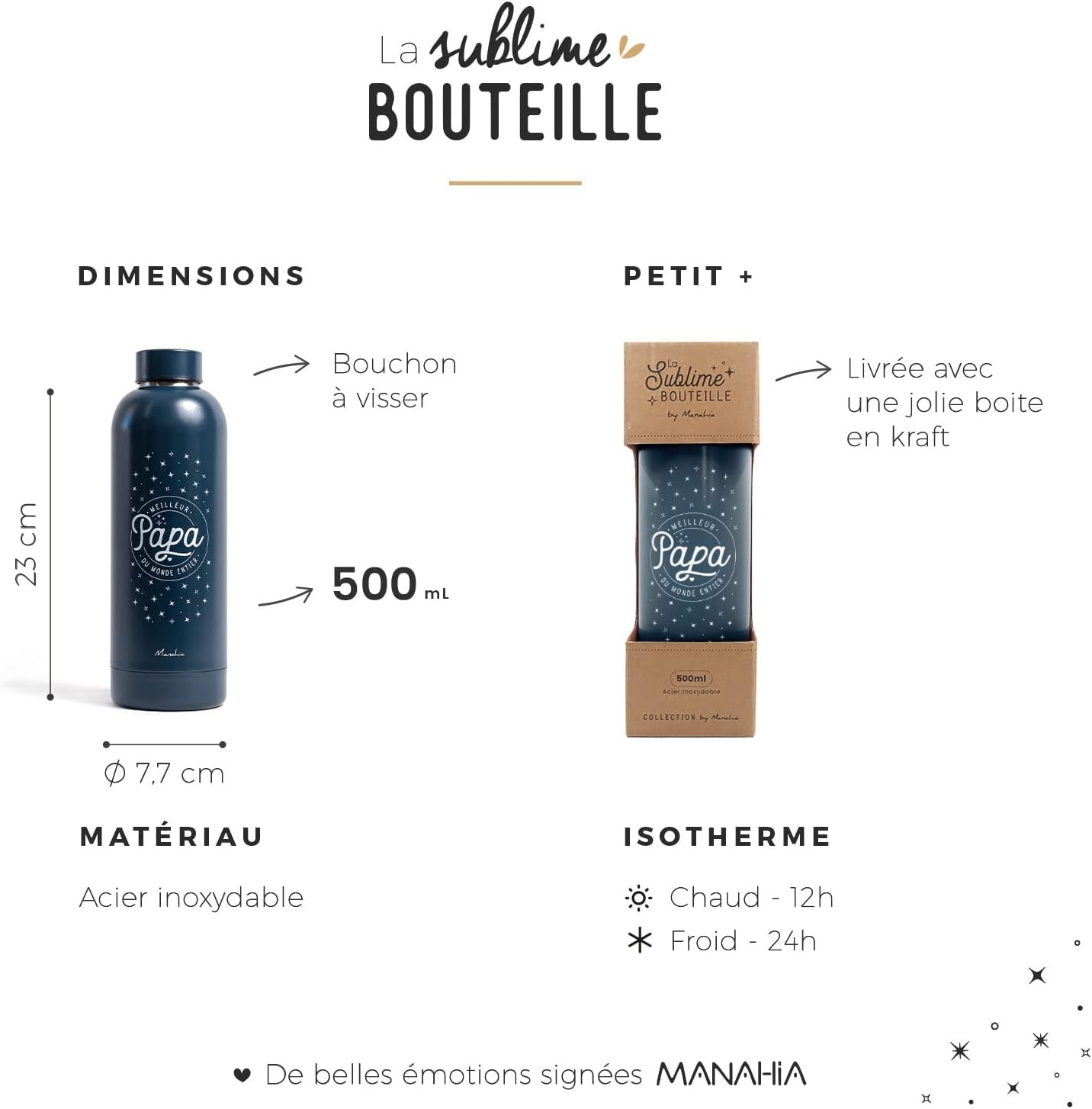 Cette bouteille isotherme en acier inoxydable est le cadeau parfait pour rappeler à votre papa combien il est formidable. Pratique et élégante, elle l’accompagnera partout au quotidien : au travail, en balade, au sport ou à la maison.