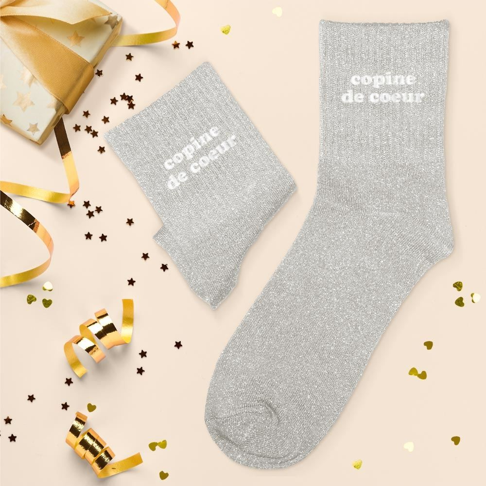 Ces chaussettes grises scintillantes, décorées de cœurs gris foncé, apportent une touche douce et élégante à toutes les tenues. La mention « Copine de Cœur » en haut de la chaussette en fait un clin d’œil affectueux, parfait pour célébrer une belle amitié. Leur matière confortable garde les pieds bien au chaud tout en ajoutant une note pétillante.