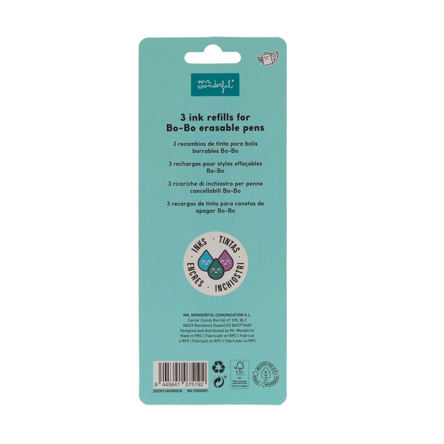 Donnez une seconde vie à vos stylos effaçables Bo-Bo de Mr. Wonderful grâce à ce lot de trois recharges aux couleurs lumineuses : bleu clair, vert et violet.