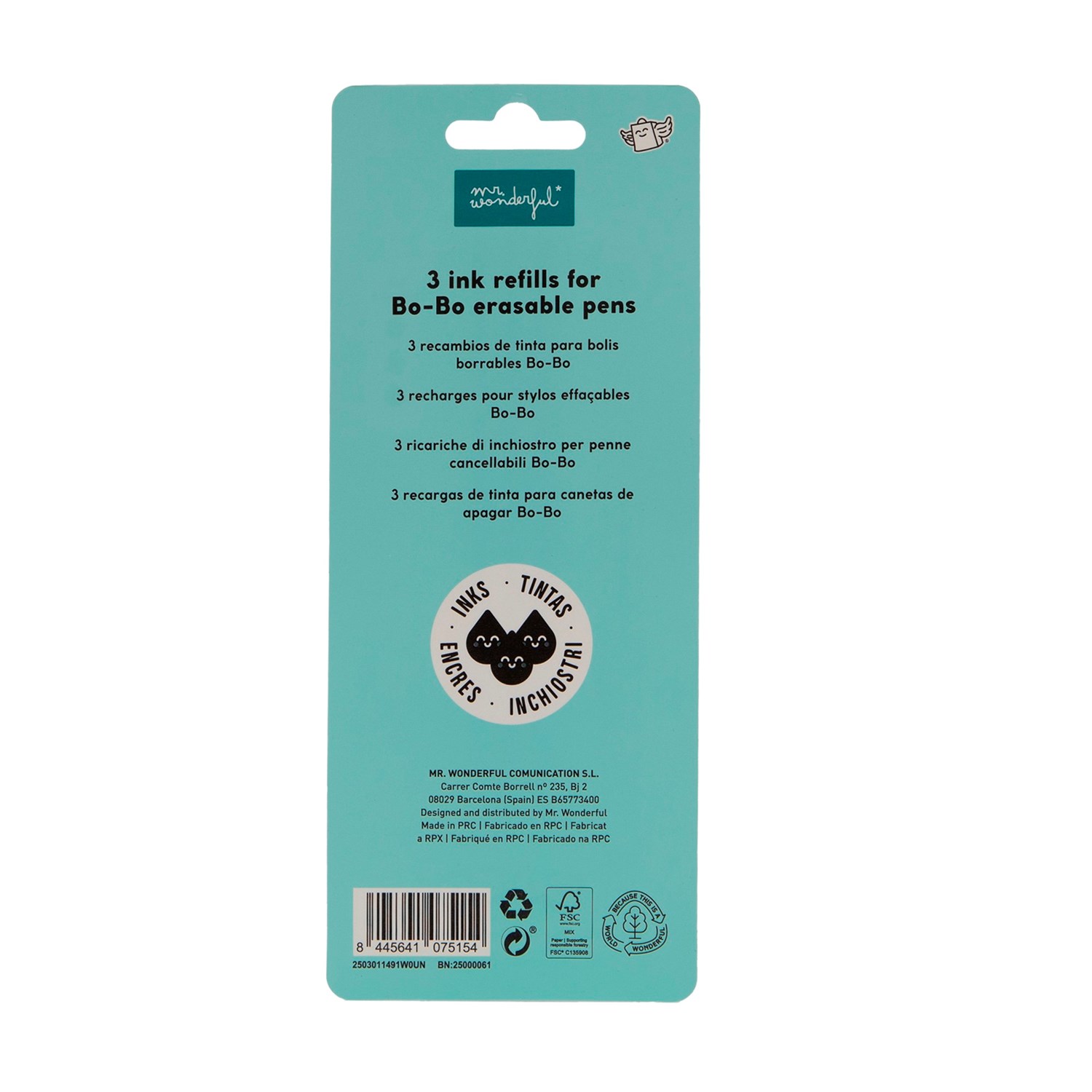 Conçues spécialement pour les stylos effaçables Bo-Bo de Mr. Wonderful, ces recharges prolongent la durée de vie de vos stylos préférés. Pour rappel, les stylos Bo-Bo sont reconnaissables à leur personnage décoratif à une extrémité et à leur gomme spéciale à l’autre, permettant d’effacer l’encre uniquement grâce à cet embout dédié.