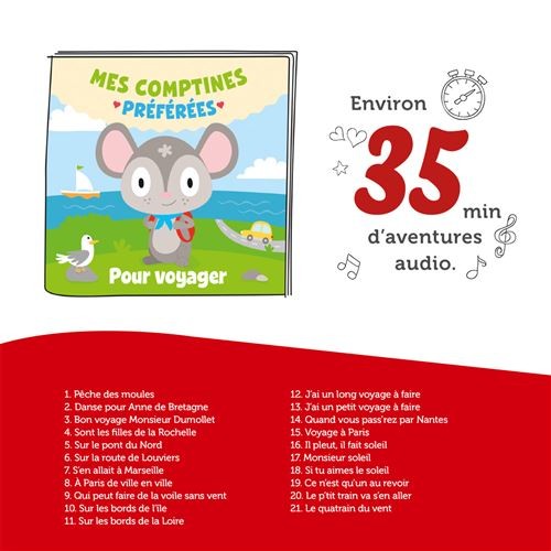 Envie de partir à l’aventure sans quitter la maison ? Ce Tonie invite les enfants à découvrir les régions de France à travers la musique avec une sélection de 23 comptines entraînantes. En savoir plus >